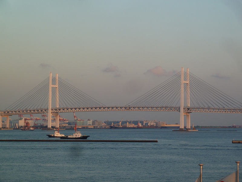大桟橋から撮ったみなとみらい方面の景色と横浜ベイブリッジの写真です。